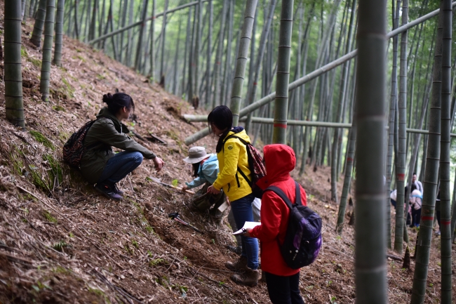 天童野外实习包括三个部分:植物实习、动物实习和土壤实习。所有同学分为三个大组六个小组分别开展实习。植物实习主要是野外识别植物和样地统计调查,各小组同学在王希华老师和杨海波老师的带领下,识别不同种植物并进行采样分装,以及野外样方拉取和植物统计。同学们积极克服种种困难——山高路陡、天气恶劣,认真完成老师布置的任务,在一次次拉取样方的过程中学会了野外考察植物的基本原则和基本方法,大大提升了野外实践能力。同学们不仅在植物实习中战胜自我登上了山顶的最高峰;也是第一次在郁密丛林中穿林而过、体会到不走寻常路的乐趣。虽然每天都很累,但是同学们都觉得很充实,很开心。