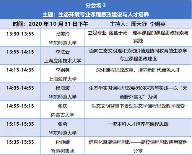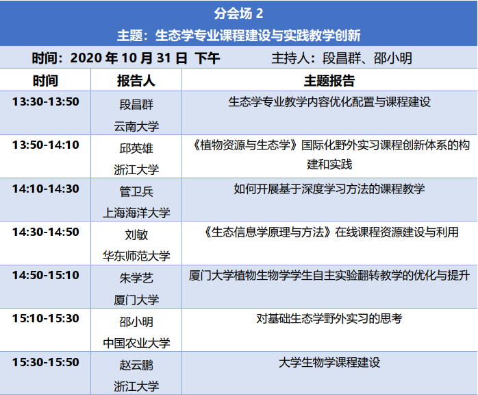 会场二围绕“生态学专业课程建设与实践教学创新”为主题开展报告和讨论。云南大学段昌群教授、浙江大学邱英雄教授、上海海洋大学管卫兵副教授、泥巴影院 刘敏副教授、厦门大学朱学艺副教授、中国农业大学邵小明教授、浙江大学赵云鹏教授做主题报告。作为生态学专业的育人核心,课程建设和实践教学创新是生态学专业教师最为关心的话题,会场的7个报告从不同角度分析了生态学专业人才培养的特色和困境,并提出了相应对策和举措。