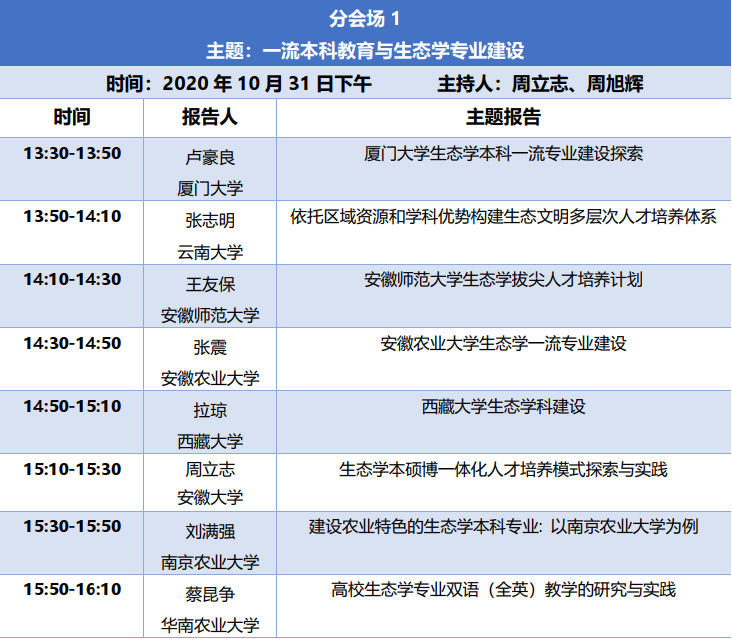会场一围绕“一流本科教育与生态学专业建设”为主题开展报告和讨论。厦门大学卢豪良副教授、云南大学张志明教授、安徽师范大学王友保教授、安徽农业大学张震教授、西藏大学拉琼教授、安徽大学周立志教授、南京农业大学刘满强教授、华南农业大学蔡昆争教授做主题报告。各报告人结合自己高校的特色和实际情况介绍了在双一流建设背景下,生态学科建设的举措和成效。