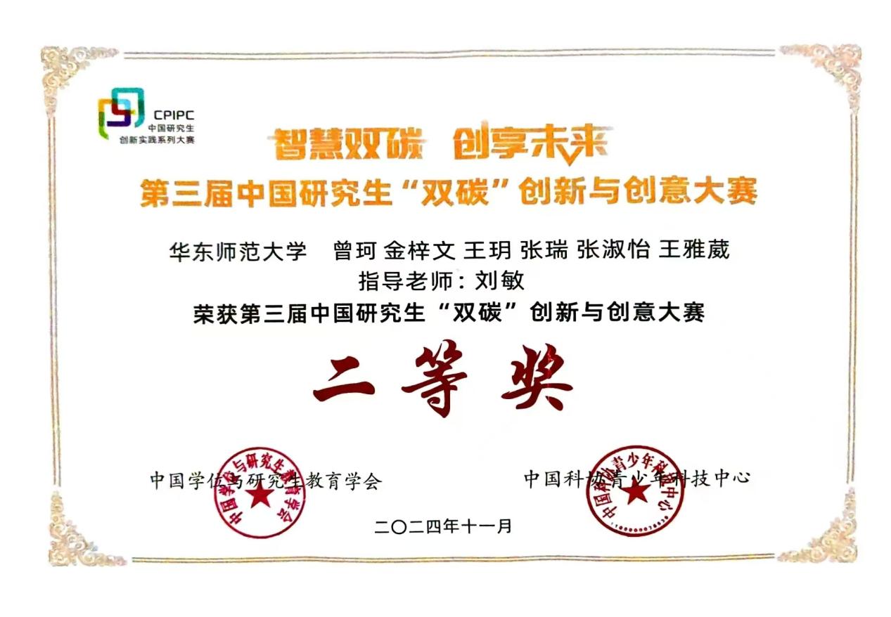 2024年11月22-24日,第三届中国研究生“双碳”创新与创意大赛决赛在武汉理工大学举行。泥巴影院 由刘敏老师指导,曾珂领队,金梓文、王玥、张瑞、张淑怡、王雅葳同学参与的《城市绿意寻踪:探索生态人文视角下的城市生态空间价值实现之旅——以上海市闵行区吴泾镇为例》项目荣获全国二等奖。由陆雪琴老师指导,衡世亮领队,吴鑫涛、孙一波同学参与的《“光”“铁”妙用—高效去除抗生素铁基光催化剂的构筑同步耦合生物膜反应器产甲烷装置的研发》项目荣获全国三等奖。