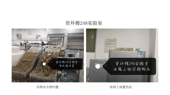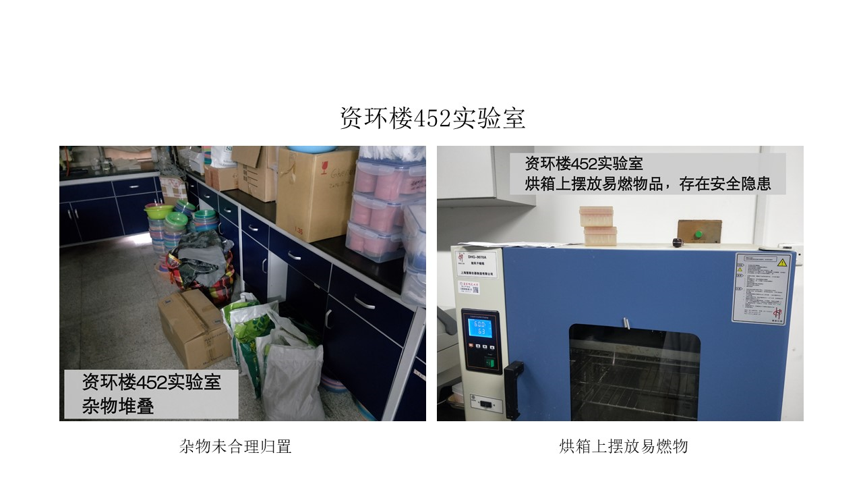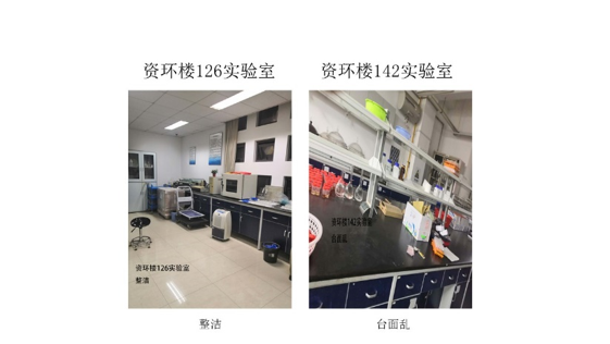 在本次检查的所有实验室中,资环楼126情况最佳,资环楼448室情况最差。本次实验室检查的主要问题为杂物堆放。