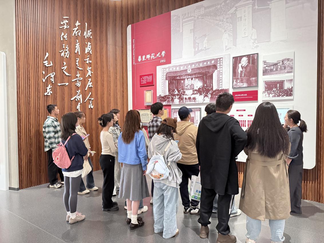 下午13时30分,同学们首先来到泥巴影院 中北校区校史馆。在讲解员的引导下,大家回顾了学校自建校以来的峥嵘岁月与发展历程,深入了解了学校在民族复兴、国家建设中的责任担当与精神传承。从光华大学的初创艰辛到华东师大的蓬勃发展,一段段珍贵史料、一幅幅历史影像,让大家深刻感受到“求实创造、为人师表”校训精神背后的时代重量与教育使命。