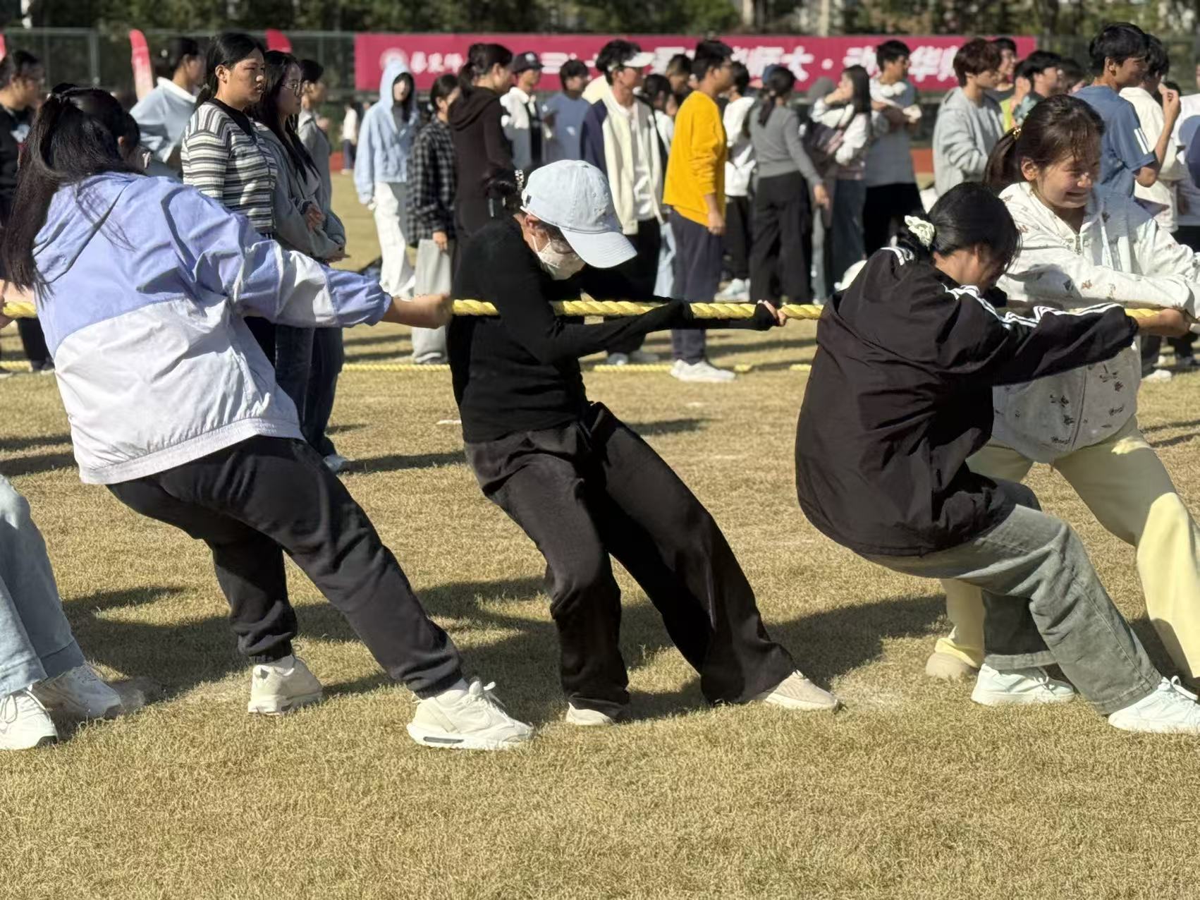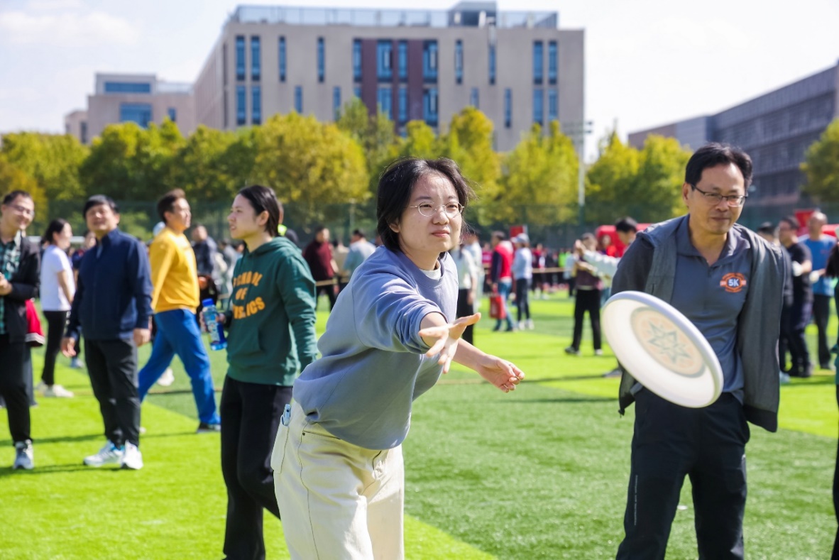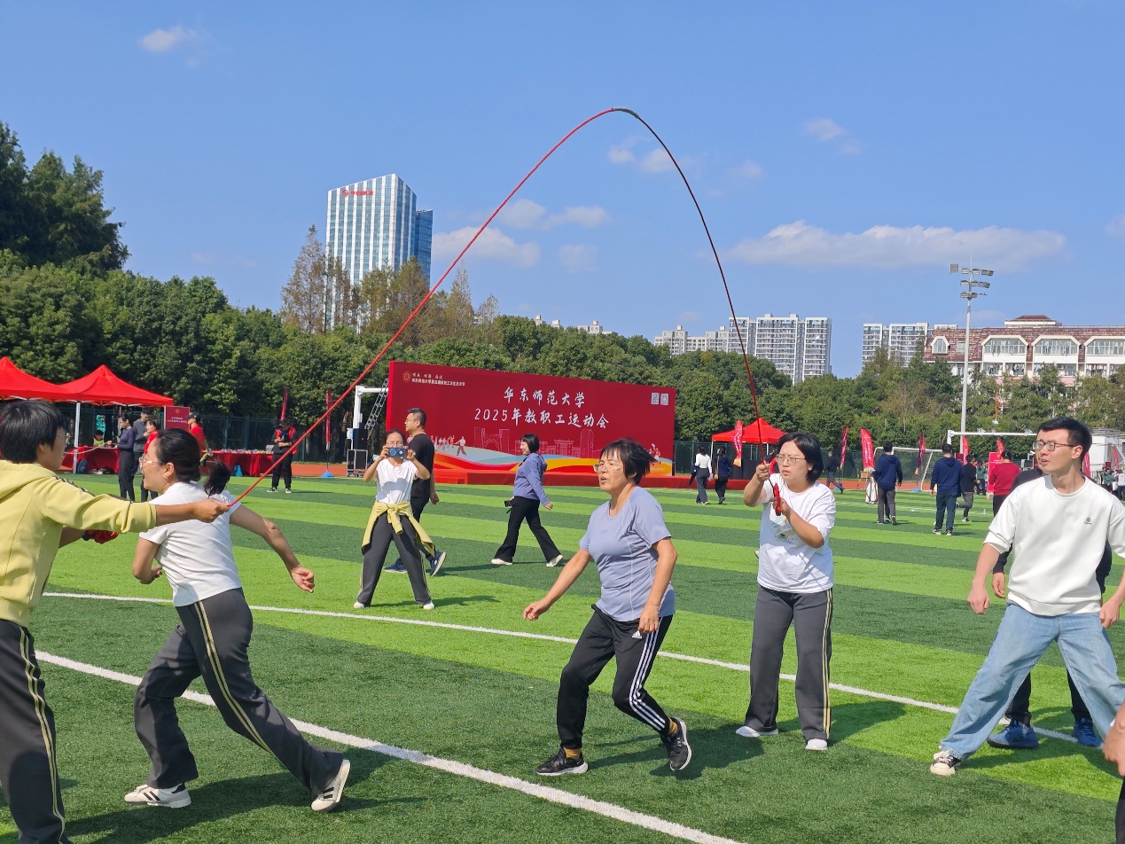 广播操赛事结束后,教职工们迅速转战西操场,投入到趣味运动会的激烈比拼中。本届趣味运动会设置“跳长绳”“障碍闯关”“飞盘九宫格”“拔河”四大项目,兼具协作性与趣味性,既是团队默契的考验,亦是运动欢乐的传递。学院根据项目特点组建五支参赛队伍——1支“跳长绳”队、1支“障碍闯关”队、2支“飞盘九宫格”队与1支“拔河”队,队员们摩拳擦掌、默契配合。赛场上,长绳起落间,队员们身轻如燕、连贯跳跃;障碍赛道上,接力队员步伐矫健、奋勇争先;飞盘投掷时,选手们瞄准目标、精准发力;拔河赛场中,队员们凝心聚力、劲往一处使,呐喊声与加油声交织成奋进的乐章。“跳长绳”队斩获二等奖,“障碍闯关”、“飞盘九宫格”、“拔河”队均荣获三等奖。