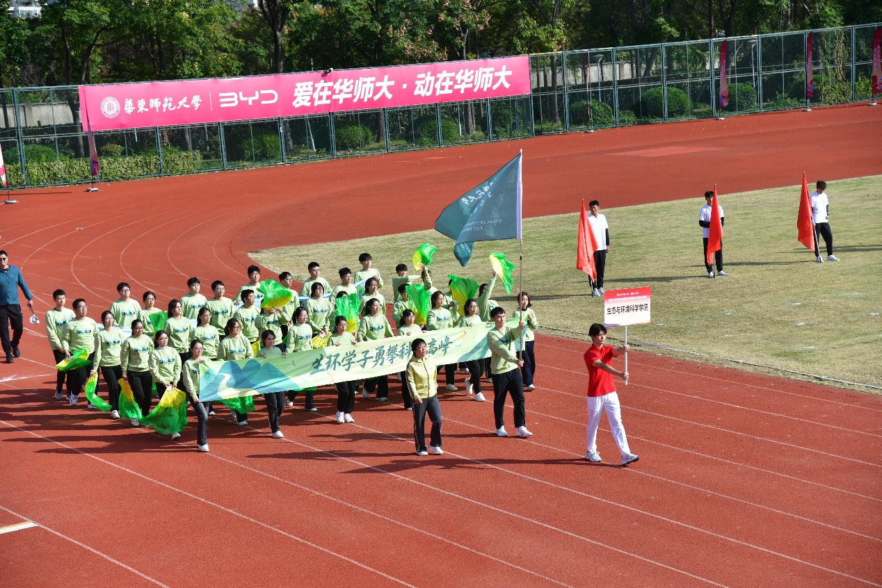 伴随着激昂的《运动员进行曲》,生环学子在学院党委书嵇渭萍的带领下,手拿绿色花扇、高举“绿水青山就是金山银山”横幅,踏着整齐划一的步伐昂首入场,“生环学子勇攀科学高峰!”在运动赛场挥洒汗水、在青春赛场用行动诠释新时代青年活力与担当!最终,学生入场式方针夺得入场式二等奖。