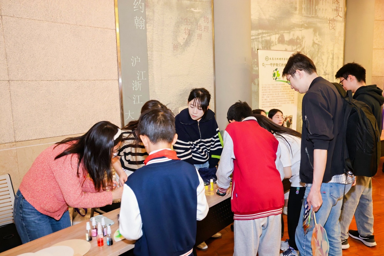 O3协会的展位旁,同学们兴致勃勃地参与着生态与环境知识竞答。每答对一题,他们便能获得一份特别的惊喜——可能是充满生机的植物盲盒、环保理念的手工包,或是印有师大美景的精美书签。与此同时,小朋友们也在轻松的氛围中,亲手制作干花植物徽章、彩绘植物团扇,在互动体验中领略了生态之美,认识到环境保护的重要性,激发了他们积极参与环保行动的热情。