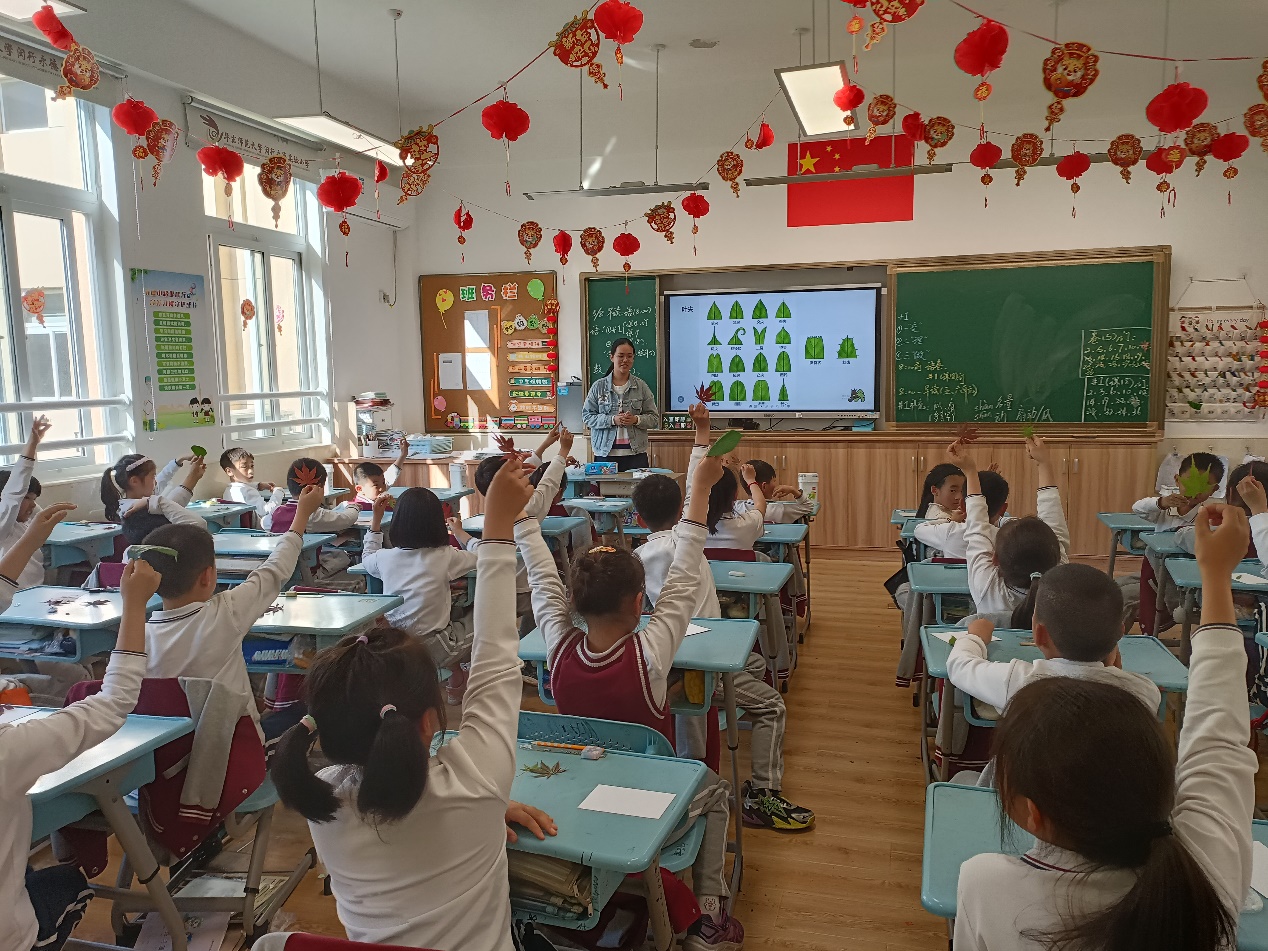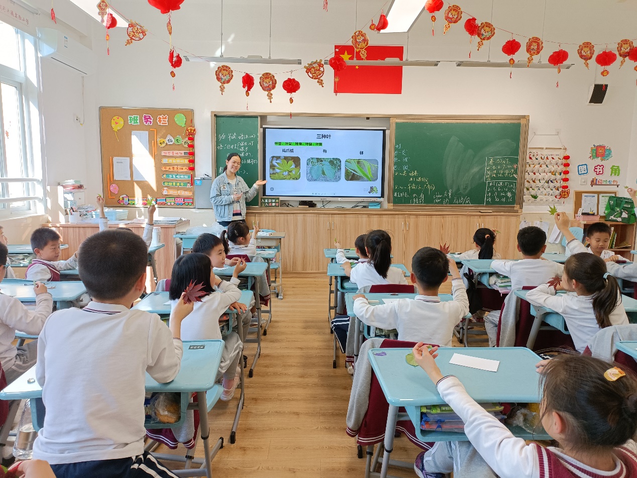 讲师向同学们具体介绍了三种不同植物的叶子:鸡爪槭、梅和柳。鸡爪槭叶纸质掌状,秋日叶红如锦,代表着满腔的赤诚与热情;梅叶缘具小锐锯齿,花迎春开放,象征着凌霜斗雪的坚强与忠贞;垂柳叶狭而长,旧时“柳”与“留”谐音,表达依依惜别之情。