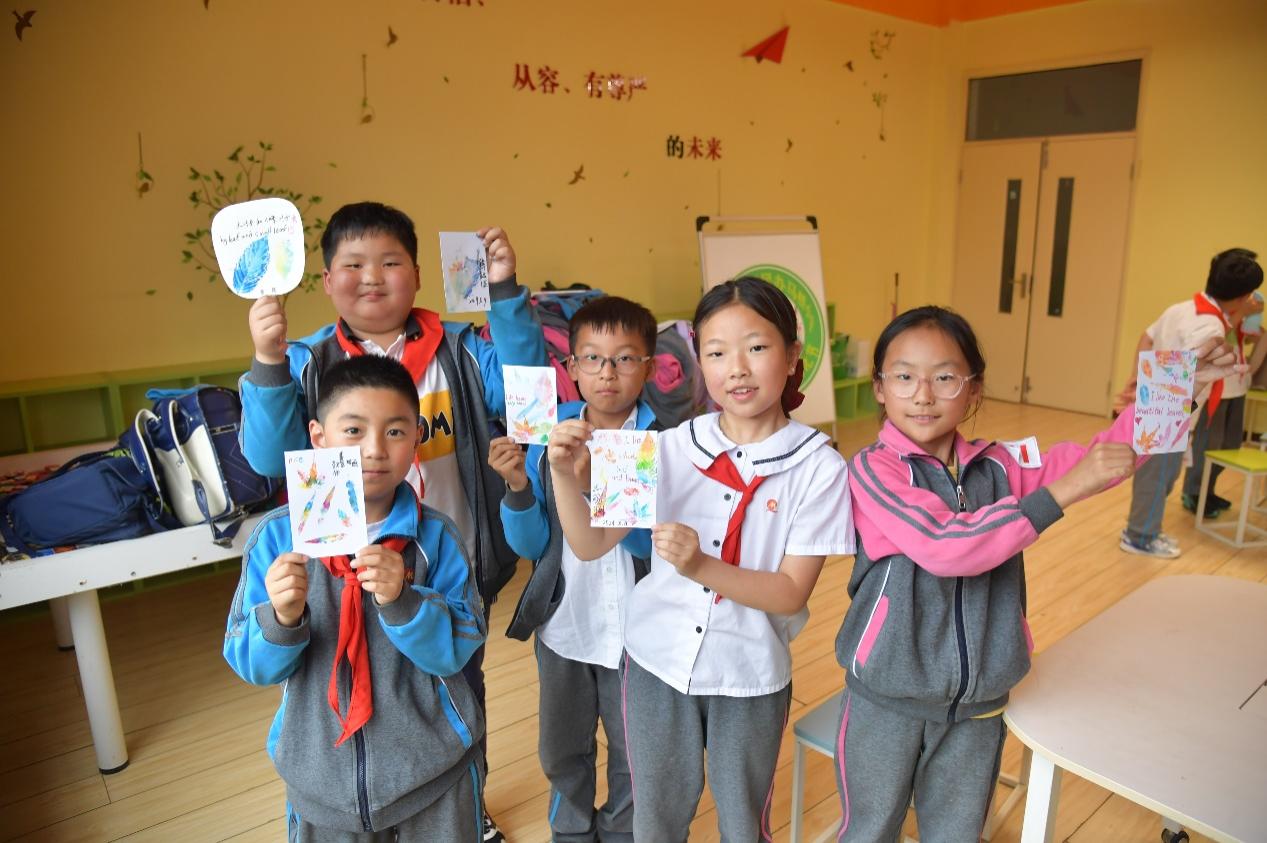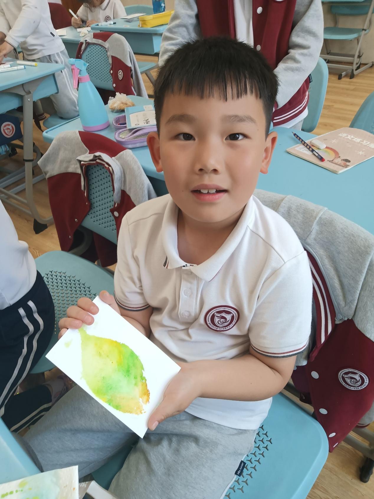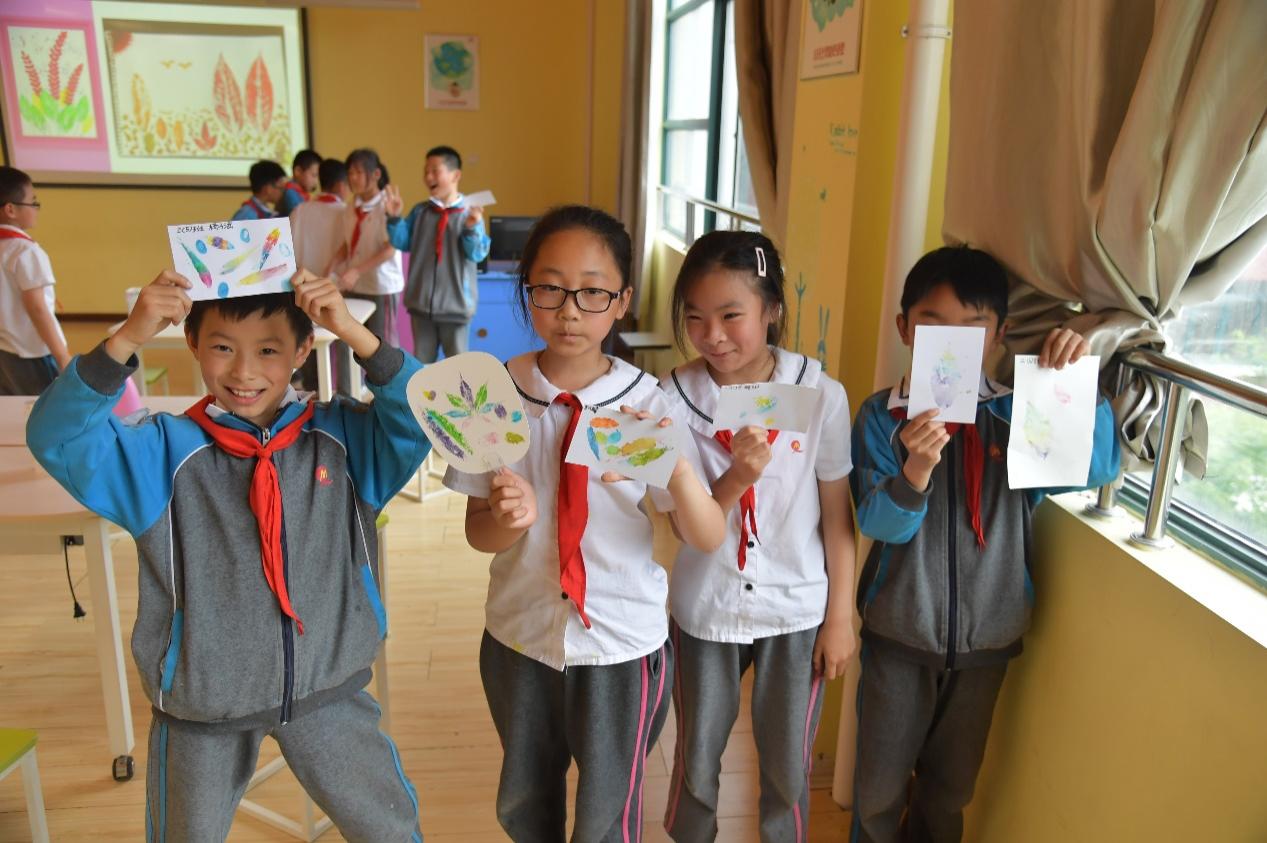 随后是小朋友期待已久的手工环节,讲师们向同学们讲解叶印的步骤:第一步,用马克笔给叶子上色;第二步,轻压叶子让颜色转印到纸上;第三步,移除叶子揭示神奇的印记。同学们挑选自己心仪的叶片,在明信片、扇子、书签上印上彩虹叶印。制作完成后,同学们相互展示自己的作品并交流创意与想法。在一片欢声笑语中,此次生态环境小课堂落下了帷幕,取一花一草,印叶片机理,存自然之色,同学们用彩虹叶印抓住了春天的尾巴,探索自然之美。