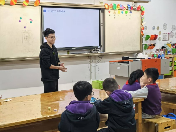 在第二环节,讲师们提出问题:“什么是土地荒漠化?”、“什么导致土地荒漠化?”,引导小学生们认真观看荒漠化主题的科普小视频。向同学们详细阐释了土地荒漠化的定义,使得这一原本抽象复杂的概念变得清晰易懂。通过分组讨论,讲师和同学们据此进行了深入地互动交流,从自然因素到人为因素,讲师们通过举例向同学们展示造成身边土地荒漠化现象的原因。