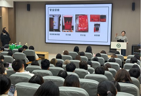 此次活动分为三个环节,第一个环节为理论讲解。作为《实验室安全教育》课程主讲教师,苏应龙指出,该课程作为环境科学与工程研究生的必修课,在夯实理论基础的同时,更注重实践能力的培养。他强调:“安全教育不能仅停留于纸面,必须通过实际演练,帮助学生在真实场景中掌握应对突发事件的能力。” 保卫处褚丽娜讲解了消防器材的正确使用方法,常见消防设备的操作要点与注意事项。她详细讲解了不同火源的扑救方式,并指导同学们在紧急情况下如何快速有效地进行初期火灾扑救。学院安全员王娟向学生们介绍了学校和学院的安全要求,结合“实验室安全事故类型”与“安全操作规范”课程章节,通过具体实验室设施,提醒同学们警惕试剂存放不当、电气设备过载、气体泄漏等常见风险,强调“预防优于救灾”的安全理念。