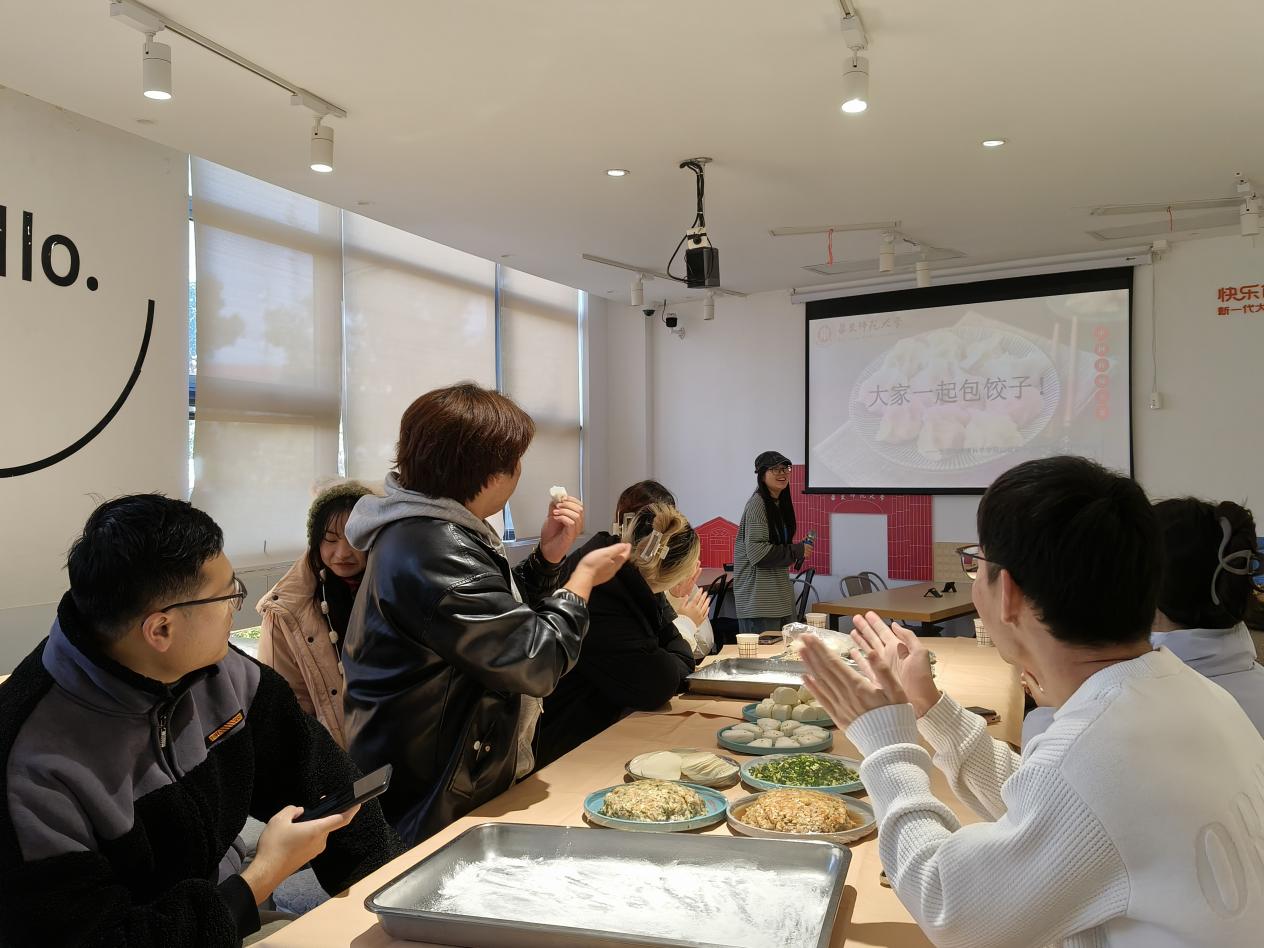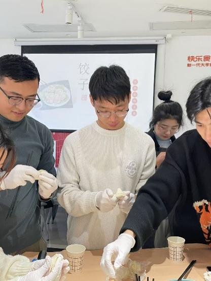 活动伊始,食堂工作人员端上精心准备好的饺子皮和馅料,并现场向同学们教学包饺子的技巧。同学们各自组成小组边学边包,期间与其他同学交流心得,不仅学会了中国传统手艺包饺子,还增进了同学们的友谊。
