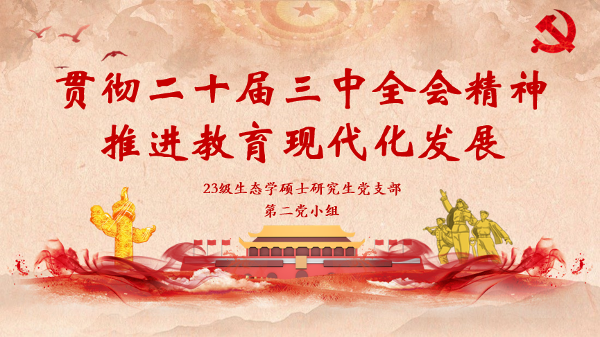 为深化全体党员同学对中共二十届三中全会精神、全国教育大会精神的理解与贯彻,精准把握全面深化改革的精髓,并深刻认识教育强国建设的长远意义,泥巴影院 2023级生态学硕士研究生党支部于2024年12月18日在资环楼354室举办了以“贯彻二十届三中全会精神,加速教育现代化进程”为核心的主题组织生活会。支部全体党员参加本次活动,支部宣传委员朱圆圆担任主持。