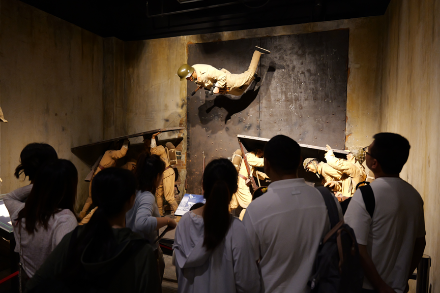 下午两点整,两个支部的全体党员和指导老师吴丹准时抵达了庄严肃穆的四行仓库抗战纪念馆,本次行走党课正式拉开序幕。当他们逐渐靠近这座纪念馆时,西墙上那些触目惊心的弹痕映入眼帘,它们犹如历史的伤痕,无声地诉说着曾经的苦难与抗争。官方讲解员介绍道,这些弹痕是当年淞沪战争爆发时,日本侵略者留下的残酷痕迹,它们见证了那段不屈不挠的抗战历史。