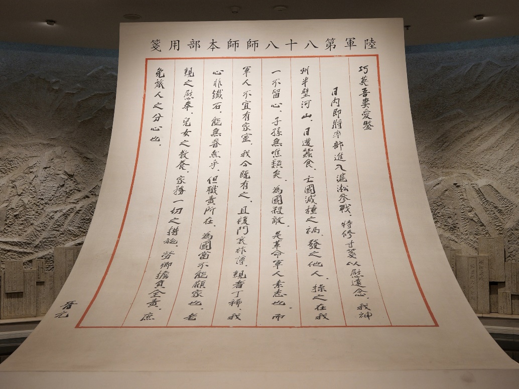 纪念馆的开篇,巧妙地以谢晋元将军在奔赴淞沪战场前夕写给妻子凌维诚的一封家书为引。这封家书深情将以谢晋元为首的“八百壮士”在国难当前之际,舍家为国的家国情怀展现的淋漓尽致。家书也是当年上海人民团结一心,投身全民族抗战、共同抵御外侮的历史见证。