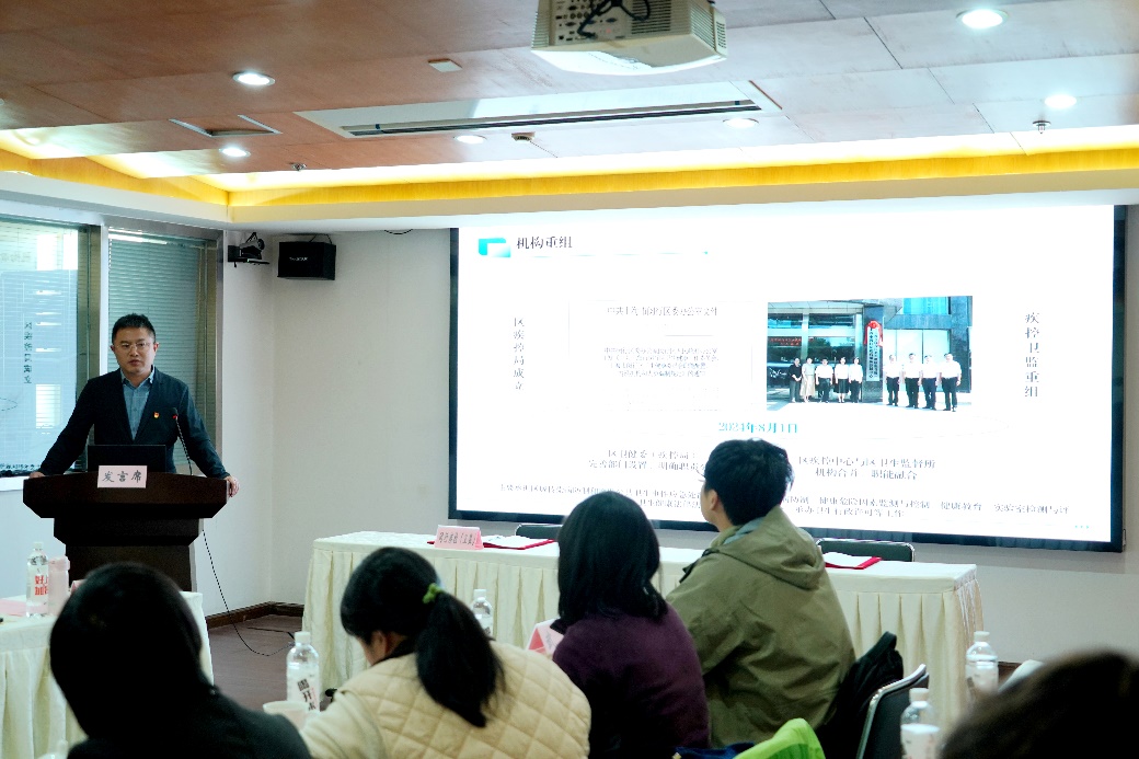 闵行区疾控中心党委副书记、主任刘小华回顾了中心的历史沿革,围绕机构合并后高质量发展规划、核心能力建设及重点工作推进等方面的有力举措进行了详细阐述,并展示了相关工作取得的丰硕成果。
