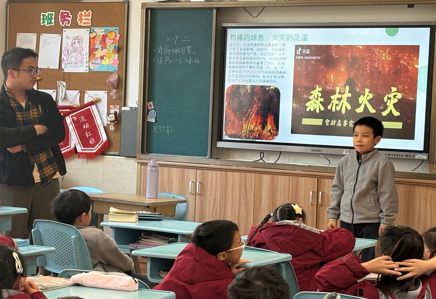 随后,讲师们通过生动的语言带同学们认识树木正在面临的生存危机和树木减少引发的问题。在理解了树木对我们重要性后,他们对这一话题表现出更大的兴趣。课堂氛围非常活跃,小朋友们都积极分享自己的想法。