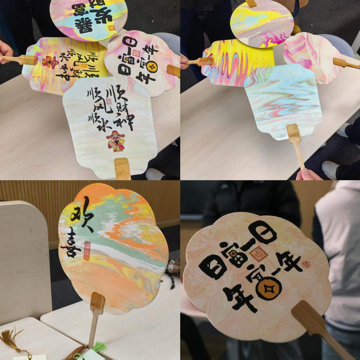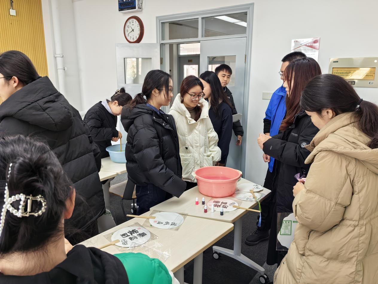 漆扇DIY环节,同学们围坐在一起,面对各式各样的漆扇和绘画工具,大家热情高涨,准备一展身手。绘制过程中,同学们积极交流各自的创意想法,将灵感倾注笔端,制作出一把把独具匠心的漆扇,为同学们送上专属的新年祝福。