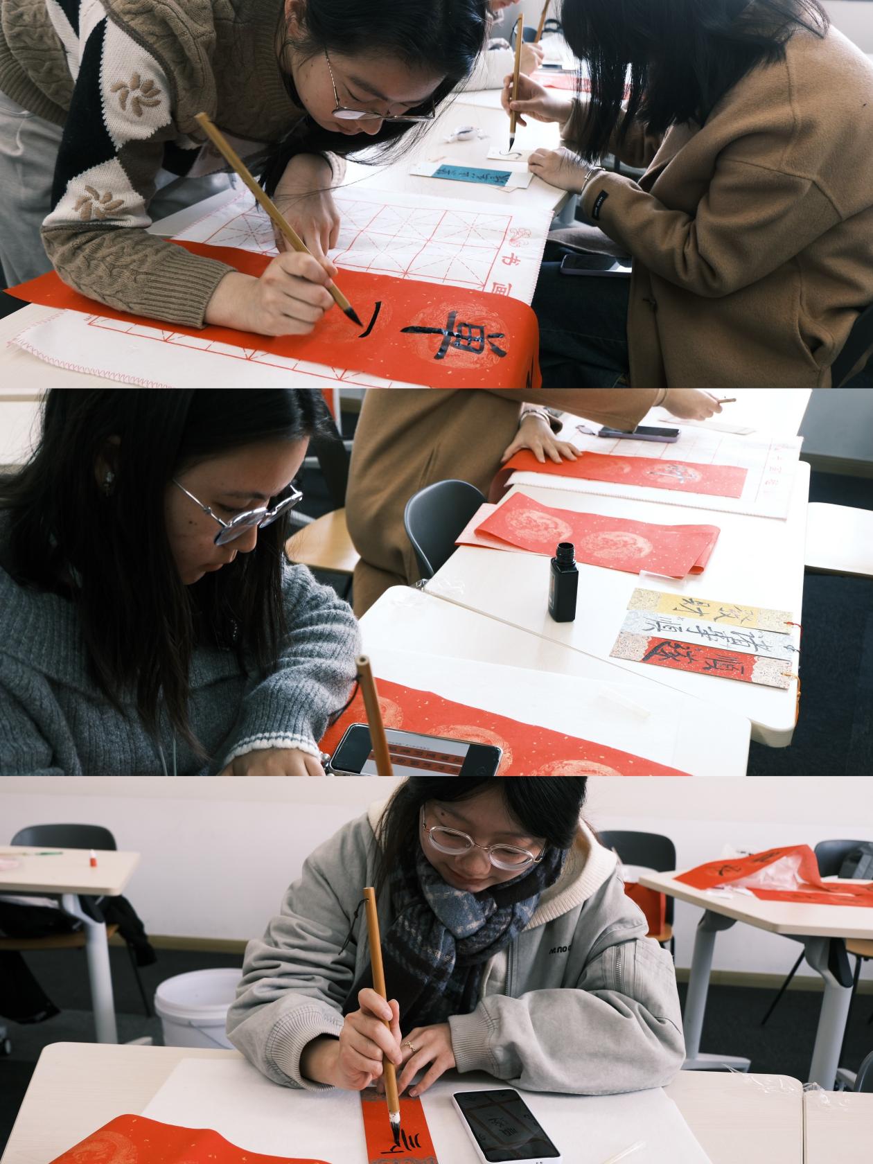 同学们在认真地写对联