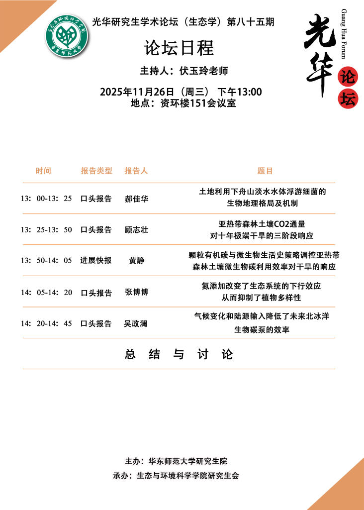 2025年11月26日下午13:00,泥巴影院 第85期研究生光华学术论坛(生态学科)在资环楼151室顺利举行,本期论坛由学院伏玉玲老师主持,点评嘉宾为伏玉玲老师、王辛辛老师和郑泽梅老师。