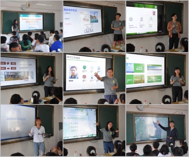 在两个高中班级中,路葵和瞿轶雯老师分别介绍了华师大和生环学院的情况,播放了2021年华师大的招生宣传片《圆的故事》,一段通过手绘漫画讲述不断认识自身、不断拓宽认知边界的故事,鼓励高中生们要不断成为更好的自己,接受更广阔世界的光,看到更大的世界。金泉泉、尹世浩等6位学生分为两组在两个班级开展“走近大学生”板块的分享,他们结合自己的高中和大学学习体会分享曾经的困惑和“豁然开朗”的心得。汪艺洁、林彤等8位同学分为两组在两个班级开展“生环小课堂”板块的分享,他们结合两周以来实践课程中的收获分享了自然的魅力、动植物的奇妙“智慧”、野外调查研究中无人机和红外相机等技术的有趣运用等,带领高中生体验一段“探索自然之旅”。张健和斯幸峰老师分别在两个班级带领同学们领略了“自然是最好的学校”和“无限风光在险峰”,两位老师丰富的求学经历、精彩的实践探索、有趣的科研故事引得同学们掌声连连,短短几分钟就“吸粉”无数。