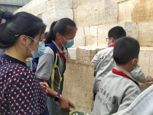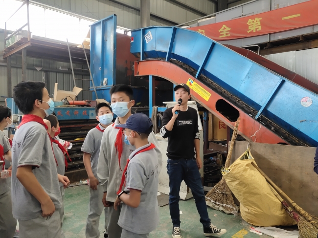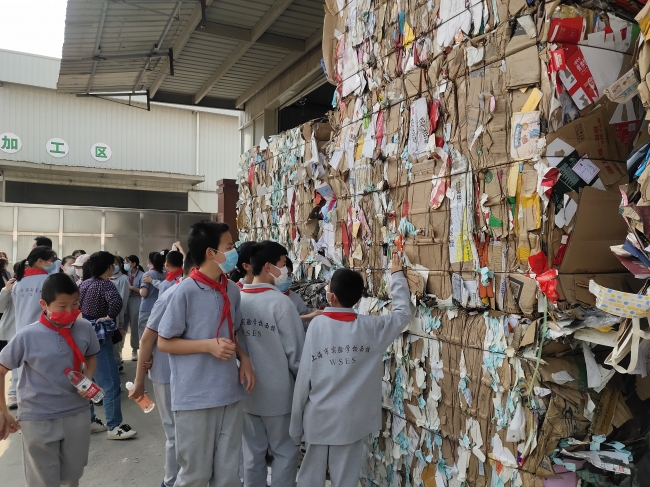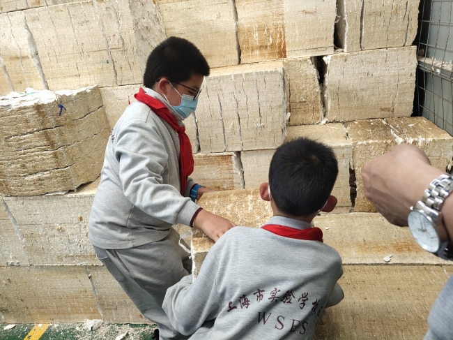 接下来是废纸箱的压缩加工过程,废弃纸箱、纸盒等都变成了一个足足有一吨的立方体,同学们兴奋地上前体验这个巨大的立方体里的纸箱究竟被压的有多紧。面对同学们“纸箱会被运到哪里”、“纸箱上的颜色如何处理”、“纸箱回收利用后变成了什么”等问题,毛经理也一一做了解答。