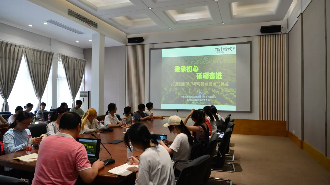 参观结束后,张巍老师给同学们介绍了西溪湿地的发展历史、综合保护工程以及生态环境监测和管理工作,张聪聪、方菁老师一同解答了同学们在景观规划、环境治理、原住民去向及智慧化管理等方面的问题,对西溪湿地的功能和可持续发展路径有了更加深入的了解。