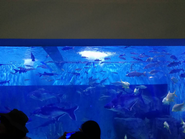 序厅展示的是有关河口方面的基础知识,有介绍长江水系流域的大型沙盘,还有国内最大的表现河口地区四季景色变化的超大弧形影像墙。仿真游艇可以让同学们体会大江大河的实景。期间,张老师和一位小同学为大家讲述了中华鲟的故事。