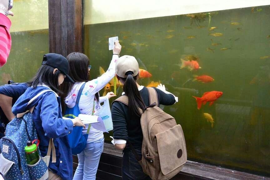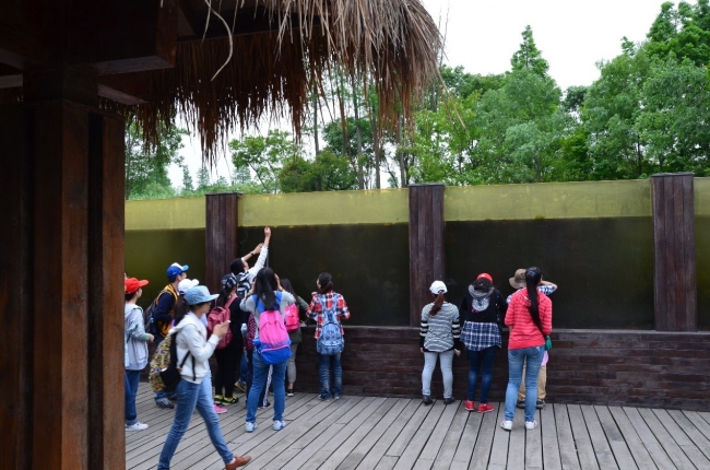 学生在水下长廊观测湿地水生生态系统的垂直结构