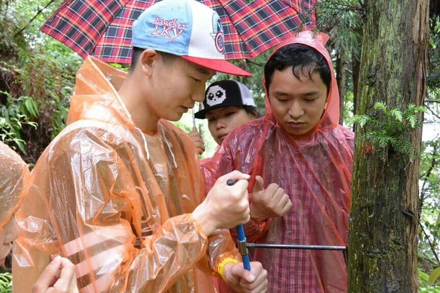 宋坤老师正在指导学生钻取树芯
