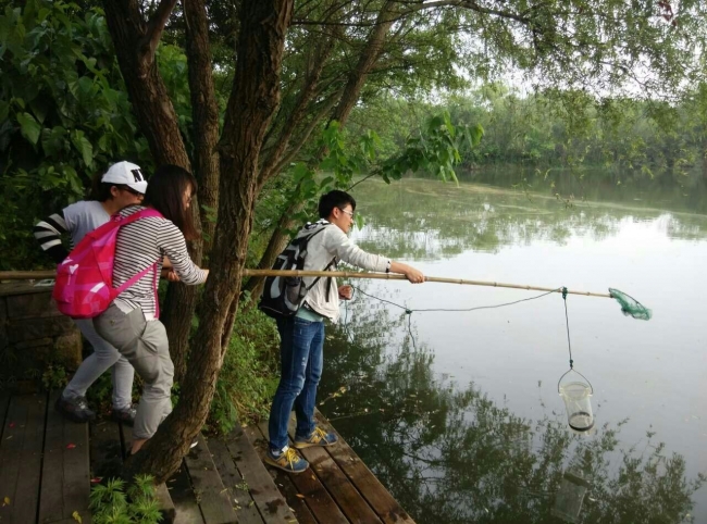 学生在西溪湿地水文观测站附近取水样