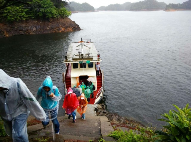 学生正在登船前往千岛湖湖面取水
