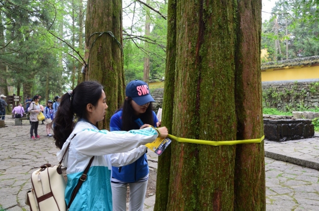 学生正在测量典型树木的胸径
