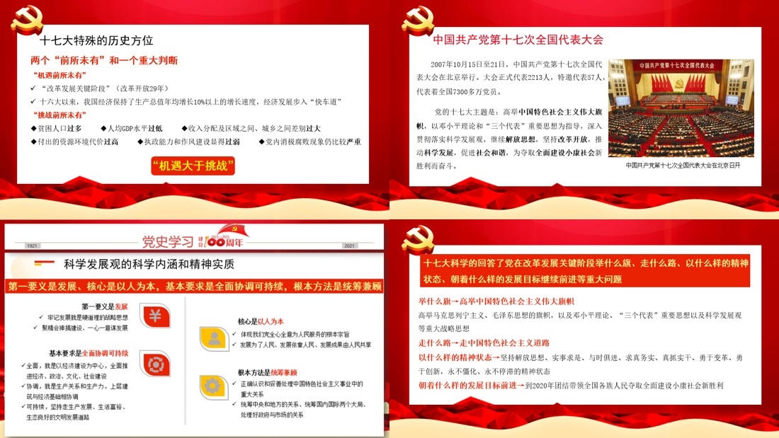 第十四讲“奋斗百年路,启航新征程——中共十六大历史回顾”由管理与支撑教工党支部党员崔玉雪讲读。崔玉雪老师为大家详细介绍了中共十六大的召开背景、召开情况、会议内容及其重要意义。十六大是我们党在新世纪召开的第一次代表大会,也是党在开始实施社会主义现代化建设第三步部署的新形势下召开的一次十分重要的代表大会。大会全面回顾了党的十五大以来5年的工作,系统总结了党的十三届四中全会以来13年奋斗历程和基本经验;把“三个代表”的重要思想确立为党的指导思想;提出全面建设小康社会的新目标。同时大会着眼于党的兴旺发达和国家长治久安,顺利实现了中央领导集体的新老交替。十六大极大地统一了全党的思想,振奋了全国人民的精神,对于确保我们胜利实现社会主义现代化的目标和中华民族的伟大复兴,具有重要的现实意义和深远的历史意义。