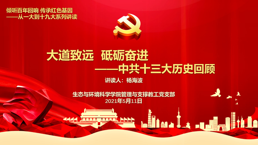 管理与支撑教工党支部开展中共十三大和中共十四大历史回顾微党课,本期讲读人为杨海波和陈然,支部全体党员和十余名学生党员参加,共同回顾了中国改革开放和现代化建设的关键时刻,我党带领全国人民进一步解放思想,把握时机,加快发展、深化改革的历史。该系列活动结合“百年跨越对话红色经典”校园主题活动日暨经典阅读季开展,微党课讲读结合《从一大到十九大:中国共产党全国代表大会史1921-2017》等书籍开展。