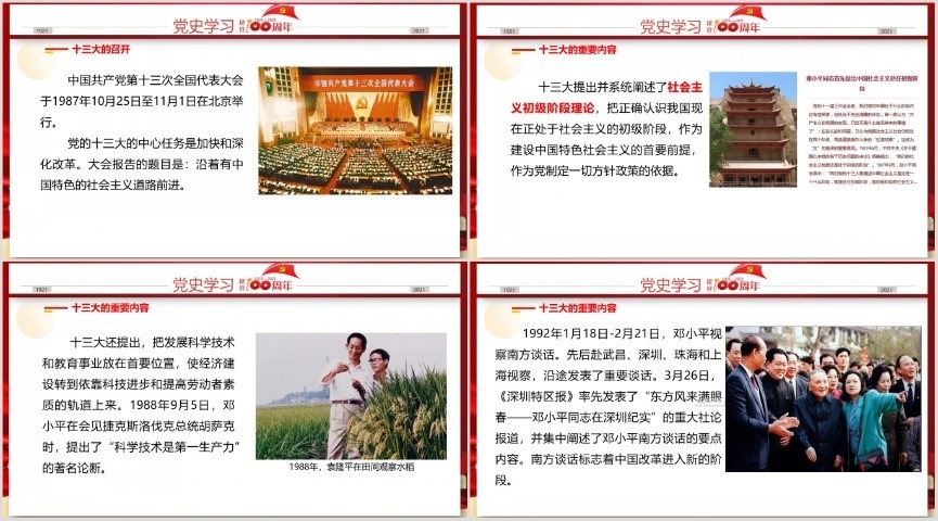 第十一讲“大道致远,砥砺奋进——中共十三大历史回顾”由管理与支撑教工党支部党员杨海波讲读。杨海波老师为大家详细介绍了中共十三大的召开背景、会议内容及其重要意义。十三大阐明了关于社会主义初级阶段的理论,明确概括了党在社会主义初级阶段的基本路线,确定了经济建设发展“三步走”的战略部署,开辟了具有中国特色的社会主义建设之路。其中,正式制定社会主义初级阶段基本路线,是十三大载入史册的最重要贡献。