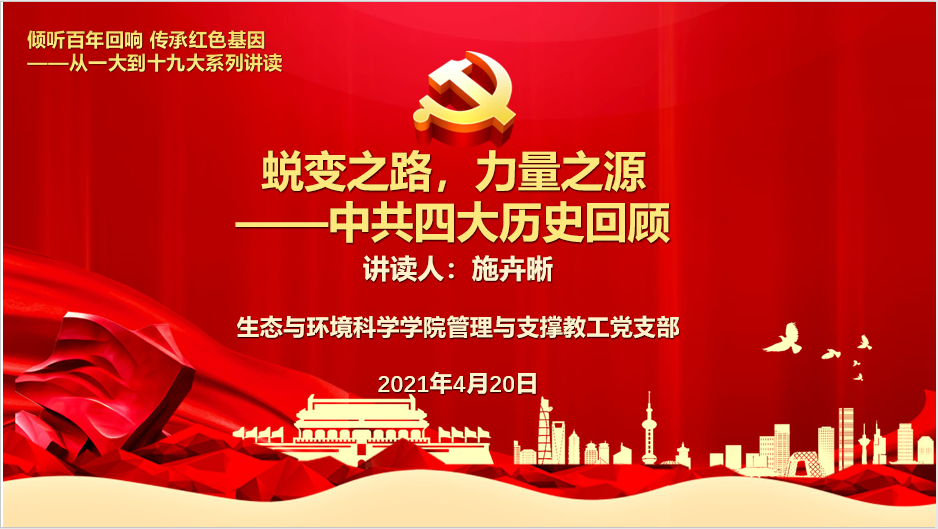 管理与支撑教工党支部开展中共三大和中共四大历史回顾微党课,本期讲读人为吴丹和施卉晰,支部全体党员和十余名学生党员参加,共同学习并铭记这段党的非凡历史,汲取能量,牢记使命。 该系列活动结合“百年跨越对话红色经典”校园主题活动日暨经典阅读季开展,微党课讲读结合《从一大到十九大:中国共产党全国代表大会史1921-2017》等书籍开展。