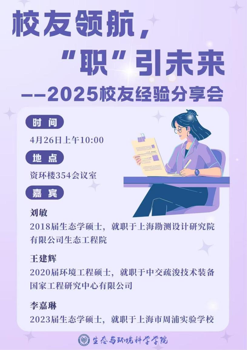 为助力同学们明晰就业态势、把握专业就业前景,确立科学的就业择业理念,合理规划职业发展路径,强化求职竞争力,2025年4月26日上午10:00在闵行校区资环楼354教室,泥巴影院 举办“校友领航,‘职’引未来——2025校友经验分享会”。活动邀请生环学院2018届校友刘敏、2020届校友王建辉、2023届校友李嘉琳三位嘉宾结合自己的工作经历和感悟进行分享。活动由院研会生涯部负责,王九洲同学主持,40余名同学参加此次分享会。