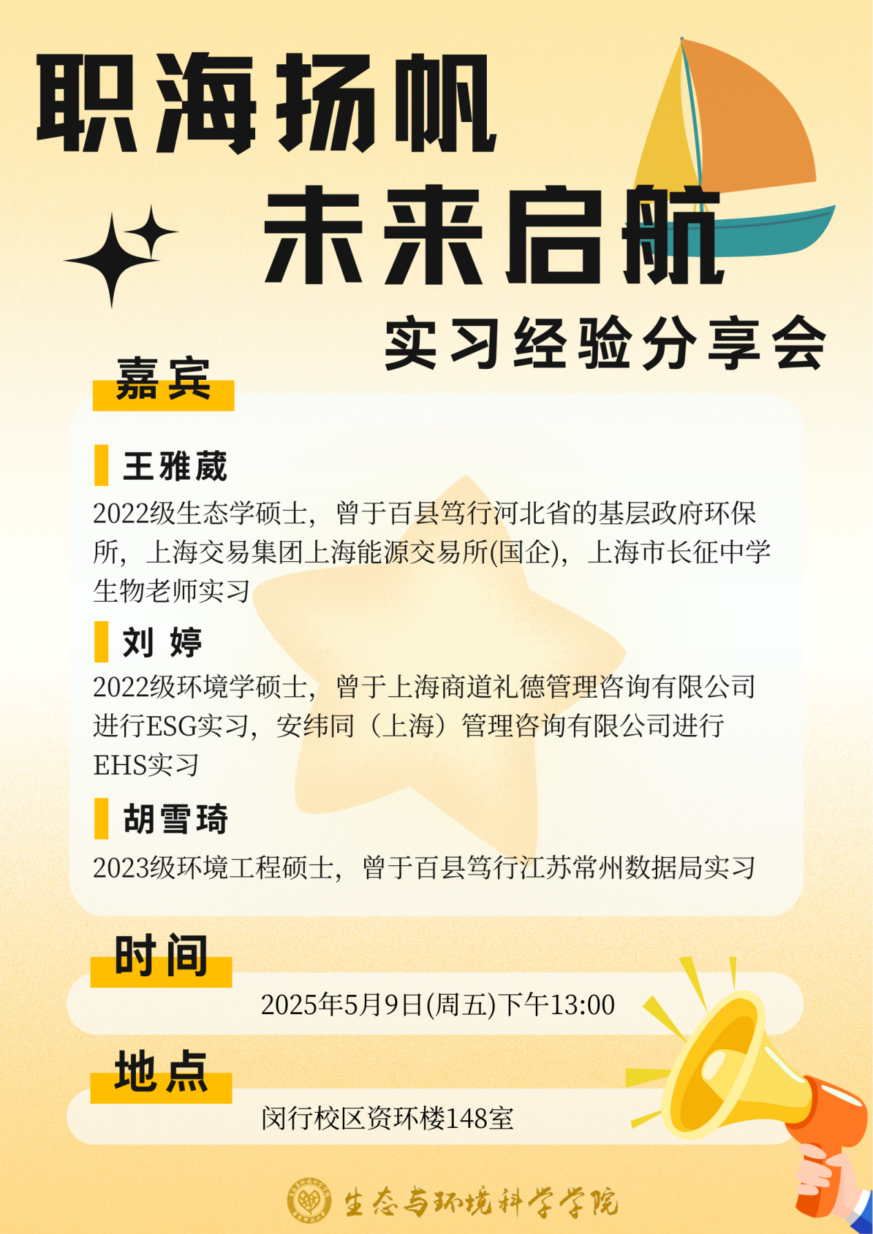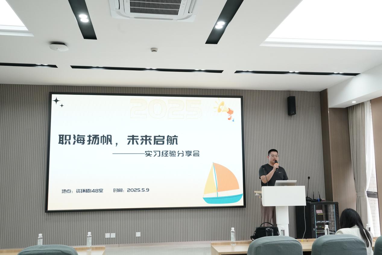 2025年5月9日下午13:00,泥巴影院 在资环楼148室成功举办“职海扬帆,未来启航”实习经验分享会。本次活动邀请了22级生态学硕士研究生王雅葳和22级环境学硕士研究生刘婷和23级环境学硕士研究生胡雪琦三位同学,她们分别根据自己的实习经历,从不同角度进行了经验分享,活动由研会生涯部部长王九洲主持。