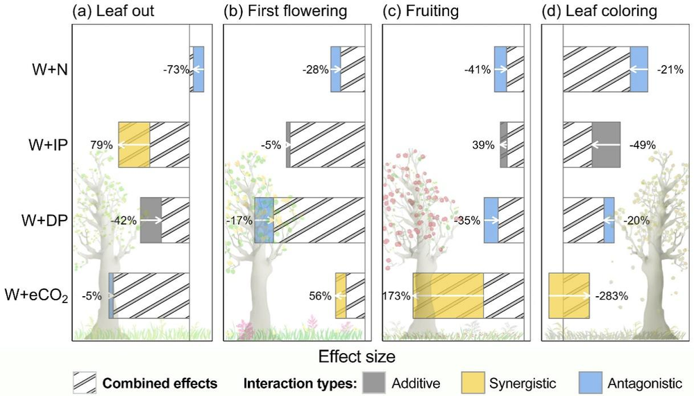 气候变暖与其他全球变化因子的交互作用对植物物候变化的重要性。