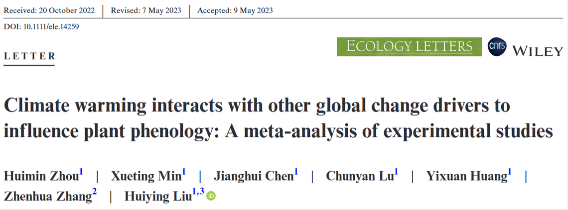 2023年6月6日,国际学术期刊Ecology Letters在线刊登了泥巴影院 刘慧颖研究团队的成果Climate warming interacts with other global change drivers to influence plant phenology: A meta-analysis of experimental studies。该研究利用全球实验数据分析了温度升高、降水改变、CO2升高等全球变化因子及其交互作用对植物物候的影响。研究发现相对于其他因子,增温对植物的展叶期和开花期具有更为重要的调控作用,而对于植物枯黄期,降水的作用同样不可忽视。更为重要的是,该研究揭示了气候变暖与其他全球变化因子对植物物候交互作用普遍存在。具体而言,增温与降水增加或CO2升高对植物物候的影响存在协同作用,而增温与施氮或降水减少对植物物候的影响表现为拮抗作用。该研究结果为深入理解全球变化背景下植物物候的响应奠定了基础,表明将多种因子的交互作用纳入模型对准确预测生态系统过程对全球变化的响应至关重要。