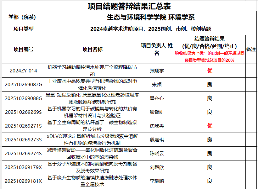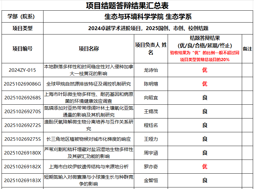 2025年5月21日下午,泥巴影院 召开2024年卓越学术进阶项目和2025年国创、市创、校创项目结题验收评审会。按照学生申报的系别方向分为两组:生态学系在资环楼234进行,评委为晏黎明、刘慧颖和伏玉玲;环境学系在资环楼273进行,评委为邓晶晶、张颖和甄广印。