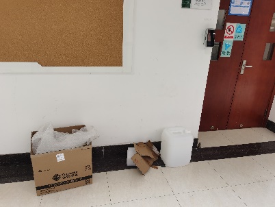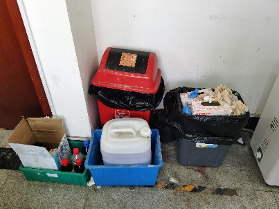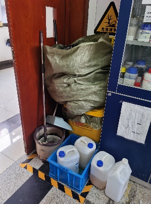 大部分实验室存在实验垃圾大量堆放、没能及时送储的问题。实验垃圾应按照回收要求分类放置,并及时下单送储,不能堆放在实验室或过道里。