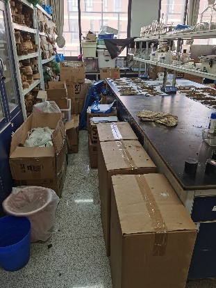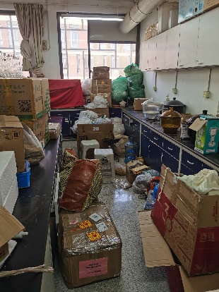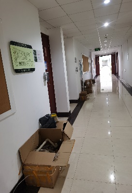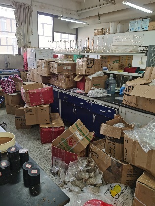 有的实验室环境杂乱,物品摆放无序,纸箱随意堆放,物品阻挡过道,需尽快整理。