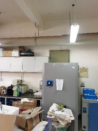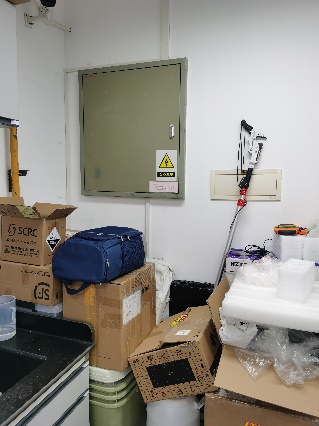 有的实验室电表箱被仪器设备、纸箱等物品遮挡,存在较大安全隐患,需及时清理。