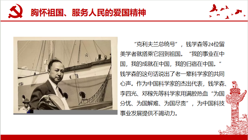 第一部分:胸怀祖国、服务人民的爱国精神。“我的事业在中国,我的成就在中国,我的归宿在中国。”钱学森的这句话说出了老一辈科学家的共同心声。作为中国科学家的杰出代表,钱学森、李四光、邓稼先等科学家用满腔热血“为国分忧、为国解难、为国尽责”,为中国科技事业发展提供不竭动力。