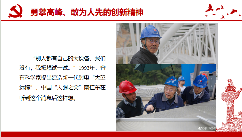 第二部:勇攀高峰、敢为人先的创新精神。从“第一生产力”到“第一动力”,中国的科学家正在续写新的历史篇章。“天宫”“蛟龙”“天眼”“悟空”“墨子”“北斗”等重大科技成果相继问世,高铁、人工智能、移动支付、第五代移动通信网络、金融科技等处于世界领先地位。更深刻的变革在于科学文化,从强调“缩小与发达国家科技水平差距”到重视“推进原始创新”,是科学家精神的升华。