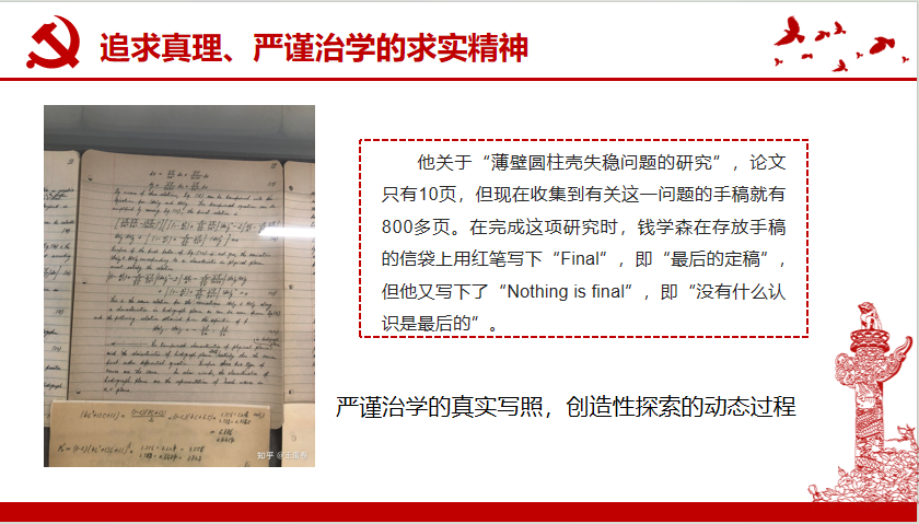 第三部:追求真理、严谨治学的求实精神。追求真理、严谨治学,这是一大批中国科学家对科学的追求。由始至终,他们都在科研中下“真”功夫、“细”功夫。正是他们这种敢于突破、敢闯新路的追求和志向,才开拓了新领域、攀登新高峰。