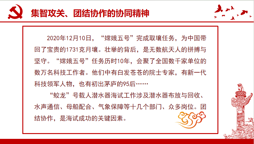第五部分:集智攻关、团结协作的协同精神。多年来,我国重大科技成果实现了从零星到井喷,从量变到质变的过程。目前,我国共授予10多万人(次)国家自然科学奖、国家技术发明奖、国家科学技术进步奖三大奖。