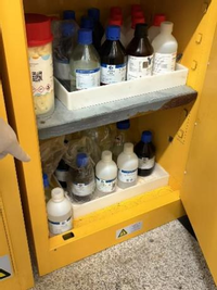 液体药品无防漏托盘;部分药品未贴码入库;有的防爆药品柜未落实双人双锁