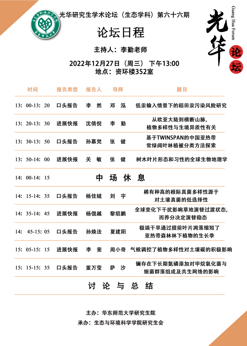 第66期研究生光华学术论坛(生态学科)在资环楼352室顺利举行,本期论坛由学院李勤老师主持。
