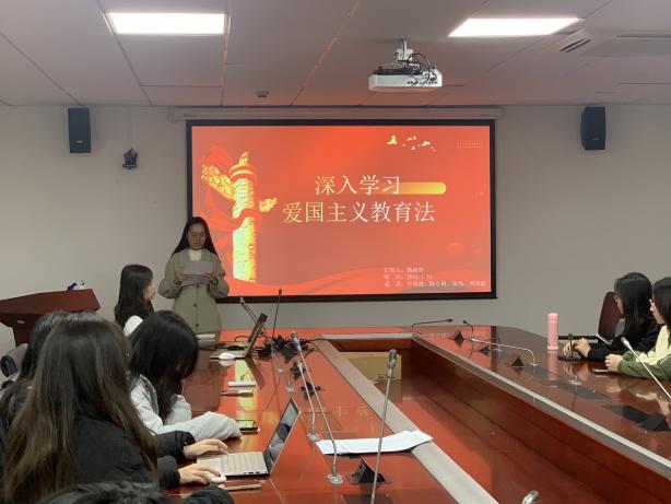 活动第一个环节由第四党小组代表杨淑贵同学进行分享汇报,分享内容主要分为四部分:爱国主义教育法的立法经过、爱国主义教育法的重点内容、爱国主义教育法的立法意义以及新时代爱国主义教育法的践行路径等。杨淑贵同学提到:爱国主义教育法的制定和施行,凸显了新时代爱国主义教育的重要性。我们要时刻保持初心,牢记使命,将爱国主义精神贯穿于学业和社会实践之中。我们应不断追求卓越,立足本职岗位,为培养更多具有家国情怀的优秀人才而努力奋斗。